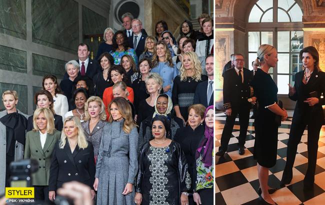 Марина Порошенко была запечатлена на фотографиях с супругой президента Франции Бриджит Макрон, княгиней Монако Шерлин и женой президента США Меланией Трамп.
