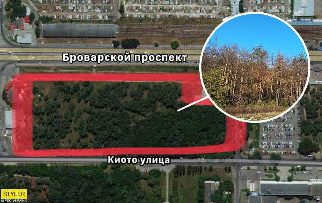 Также в сообщении указано: "Чтобы киевлянам удобнее было сориентироваться, где это все происходит, - прикладываем скриншоты с Гугл-карты: вот этот лесной массив на сегодняшний день перестал существовать, все деревья одновременно погибли".