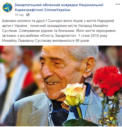 "Ушел из жизни Народный артист Украины, почетный гражданин города Ужгород Михаил Сусликов. Сочувствуем родным и близким. Его жизнь неразрывно связана с ансамблем "Юність Закарпаття". 1 января 2018 года Михаилу Львовичу Сусликову исполнилось 96 лет", - говорится в сообщении.