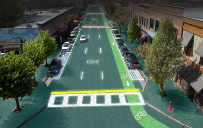 Фото: Використання сонячних панелей поліпшить не тільки самі дороги, але і прилеглу інфраструктуру - на знімку показана підсвічування вільних паркувальних місць (solarroadways.com)