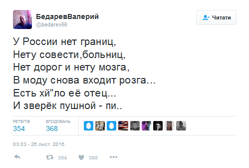 "У России нет границ, нету совести,больниц, нет дорог и нету мозга, в моду снова входит розга", - пише користувач.